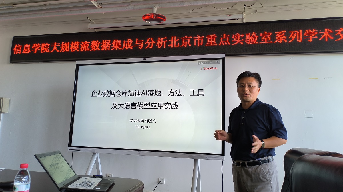 2023年9月20日上午,威尼斯9499登录入口大规模流数据集成与分析技术北京市重点实验室邀请了酷克数据首席科学家杨胜文博士进行了题为“企业数据仓库加速AI落地:方法、工具及大语言模型应用实践”的学术报告和交流。本次报告由实验室的王桂玲研究员主持,实验室主任韩燕波教授代表实验室师生对杨胜文博士表示了热烈的欢迎,威尼斯9499登录入口七十多位同学参加了此次学术活动。